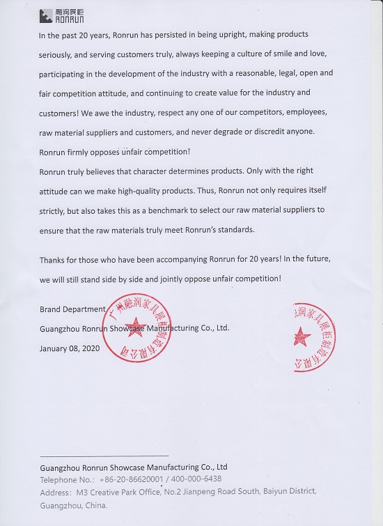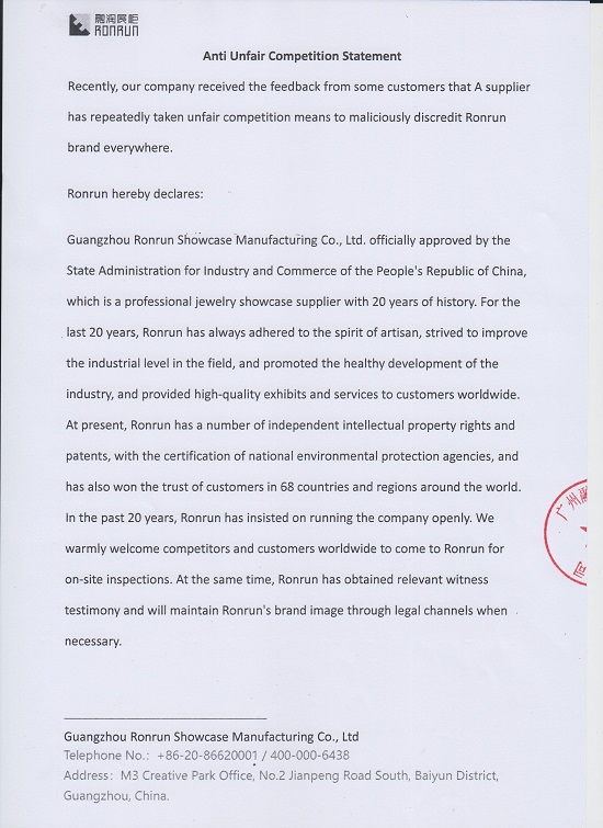 Guangzhou Ronrun Showcase Manufacturing Co., Ltd. officially approved by the State Administration for Industry and Commerce of the People's Republic of China, which is a professional jewelry showcase supplier with 20 years of history. For the last 20 years, Ronrun has always adhered to the spirit of artisan, strived to improve the industrial level in the field, and promoted the healthy development of the industry, and provided high-quality exhibits and services to customers worldwide. At present, Ronrun has a number of independent intellectual property rights and patents, with the certification of national environmental protection agencies, and has also won the trust of customers in 68 countries and regions around the world. In the past 20 years, Ronrun has insisted on running the company openly. We warmly welcome competitors and customers worldwide to come to Ronrun for on-site inspections. At the same time, Ronrun has obtained relevant witness testimony and will maintain Ronrun's brand image through legal channels when necessary.